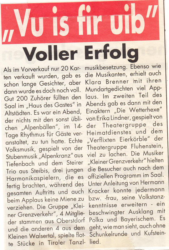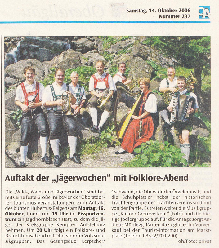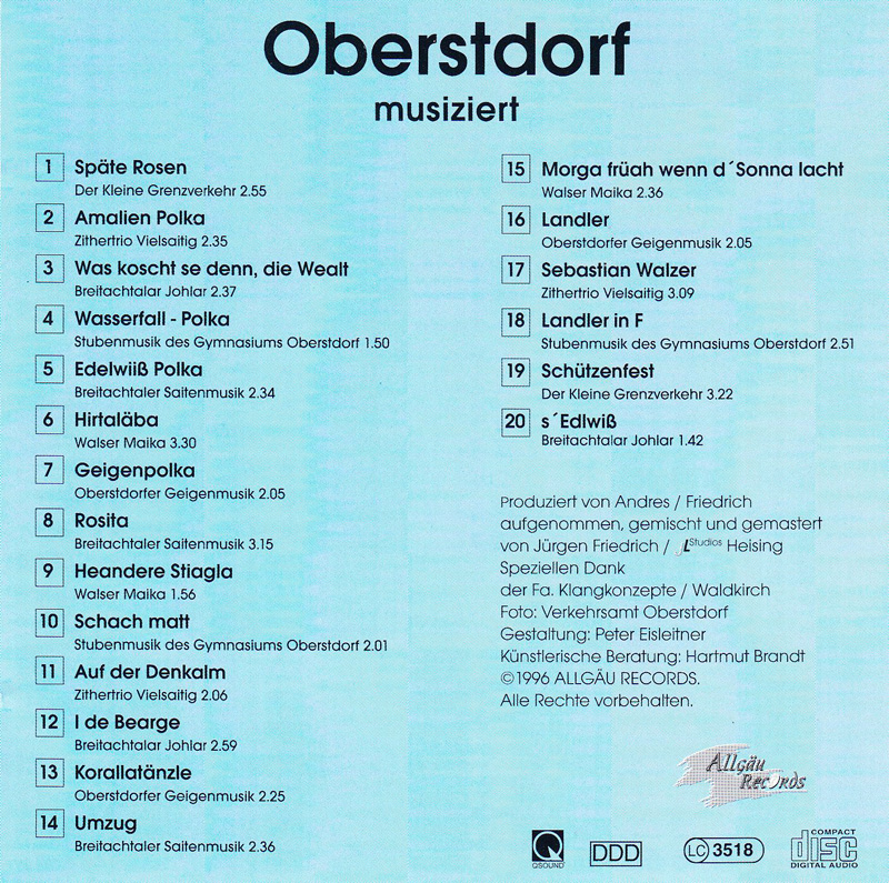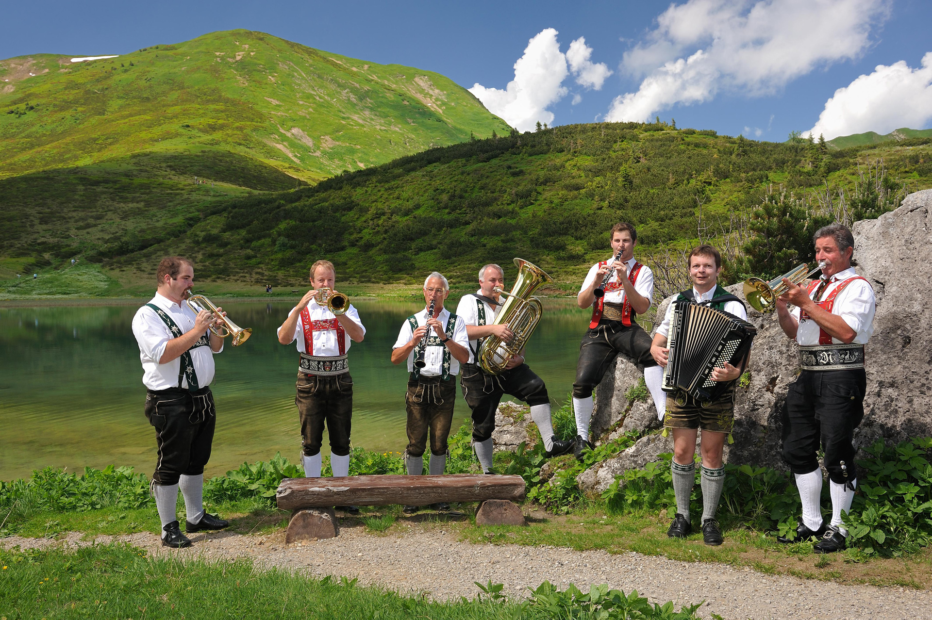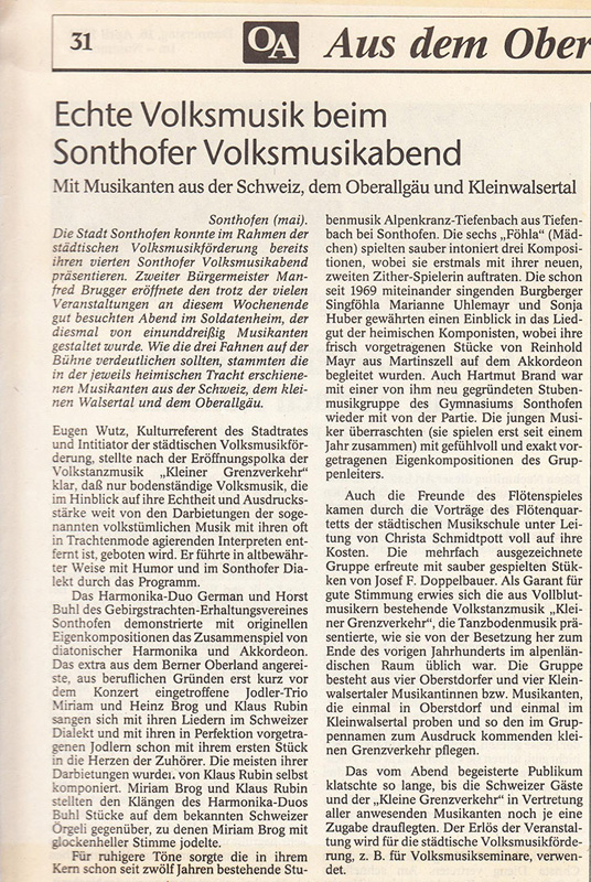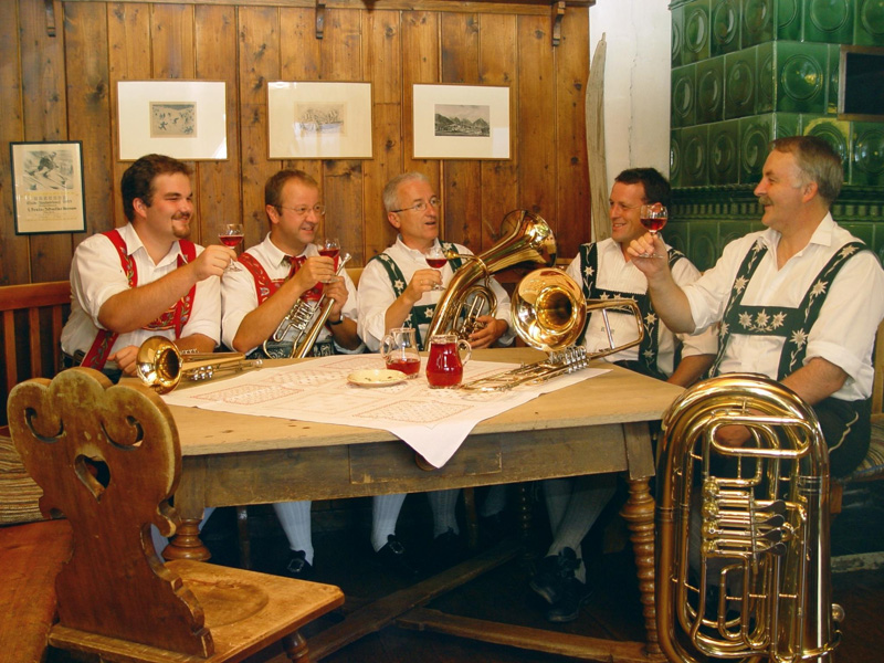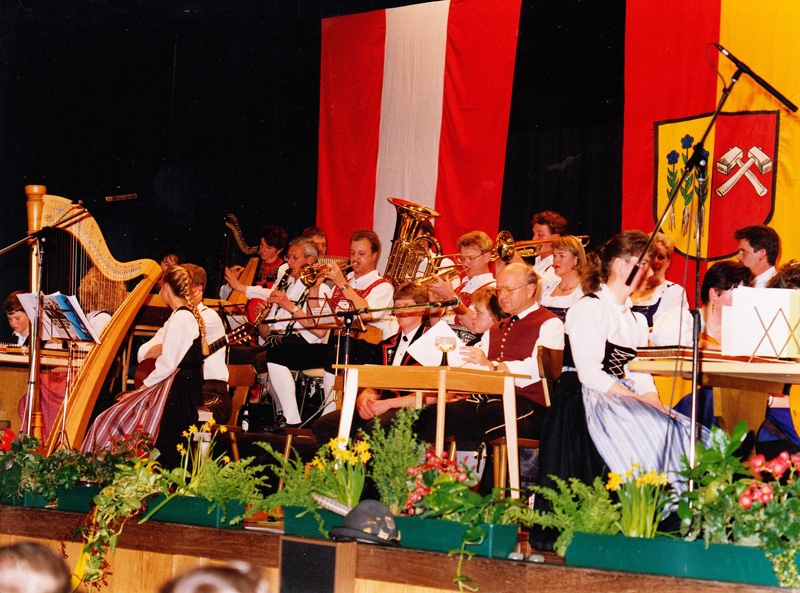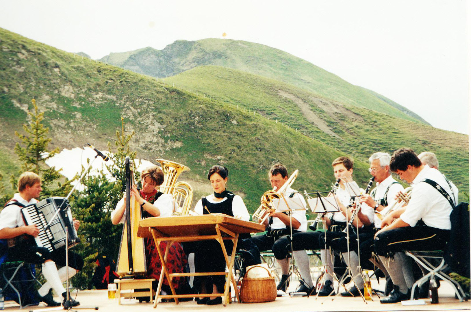 Vincenz Kling, Thomas Höng, Flügelhorn, Dieter Nocker, Baßflügelhorn, und Peter Kling, Tuba. Aus Hinterstein die Hintersteiner Jodler, die Raffelemuseg Hüttlinger-Milz und die Familienmusik Wechs.