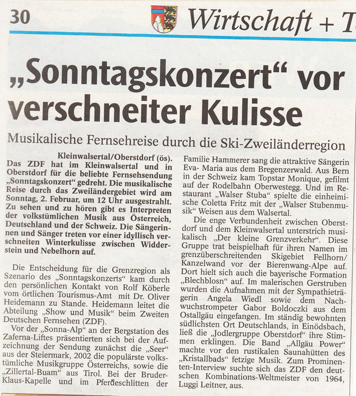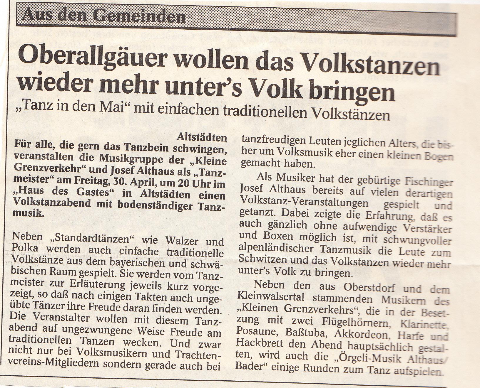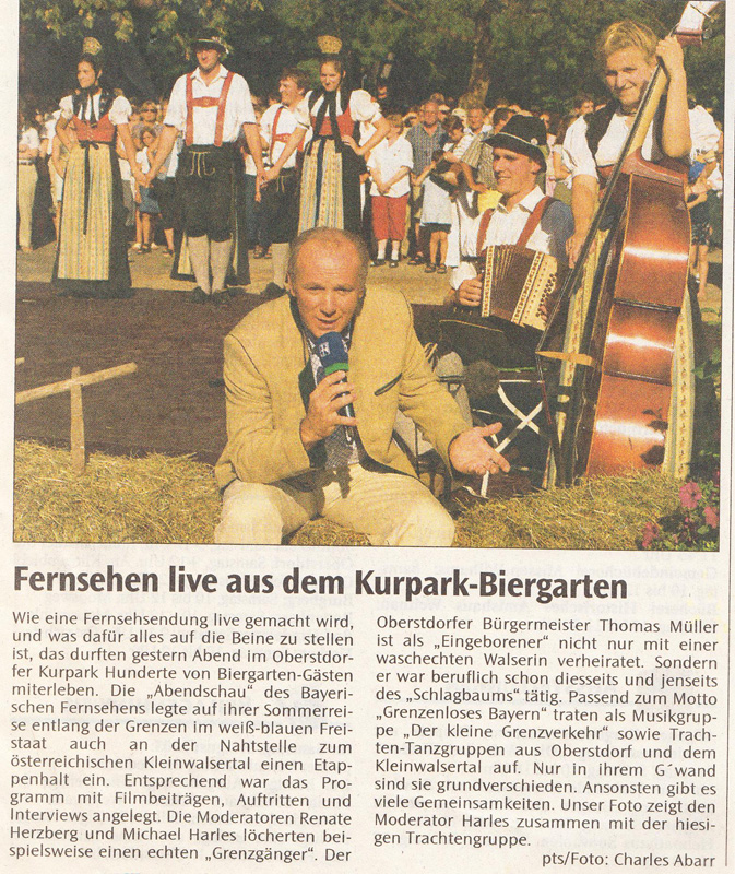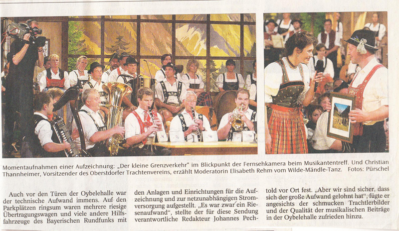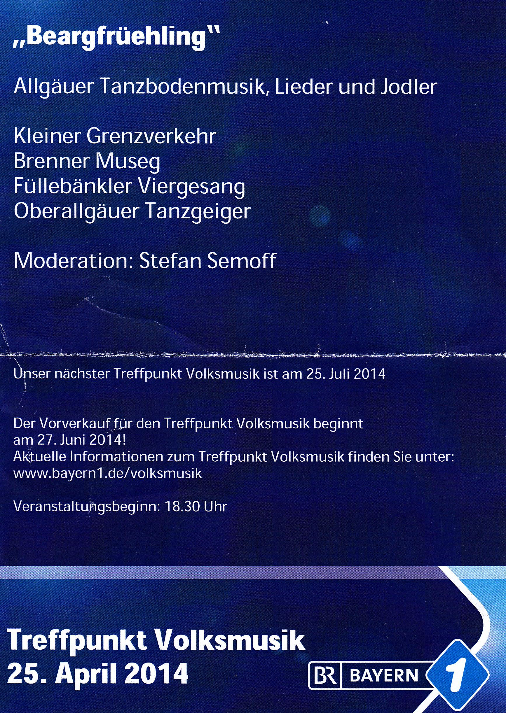 25.04.2014 Treffpunkt Volksmusik im Studio 2 des Bayerischen Rundfunks in München. Der Kleine Grenzverkehr spielt zusammen mit anderen Allgäuer Musikanten live im Rundfunk. Der 2. Teil wurde am 20.06.2014 ausgestrahlt. Das Stück „Mühlebächle“ von Markus Littich erfährt über den Sender seine Uraufführung.
