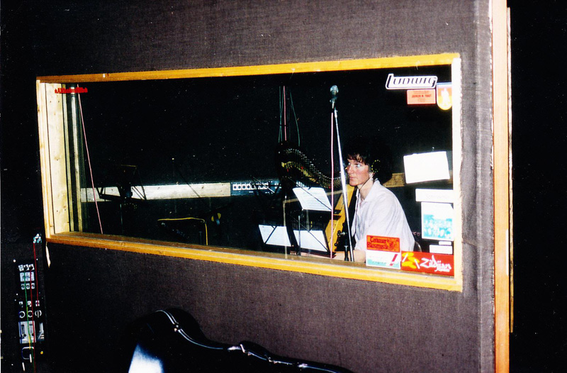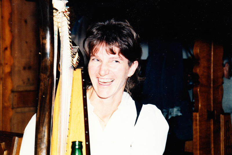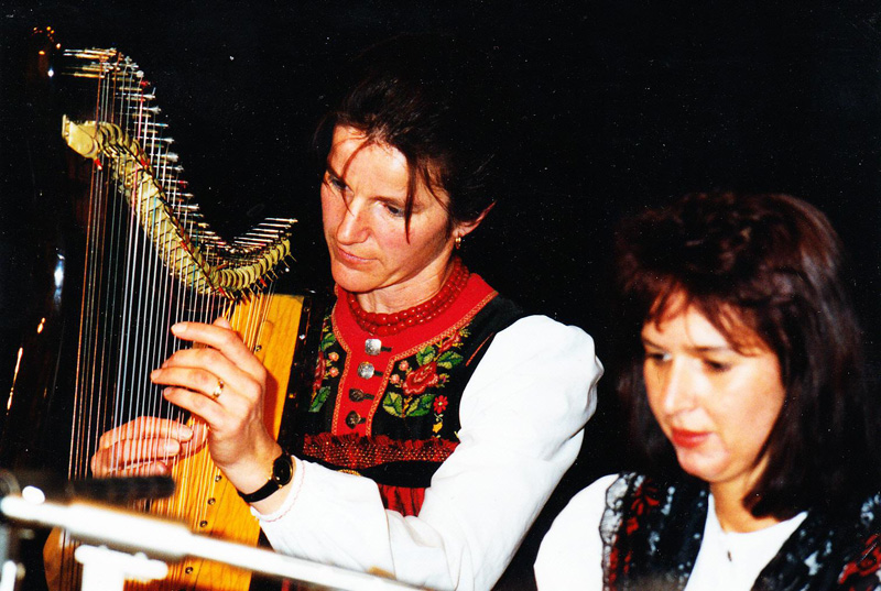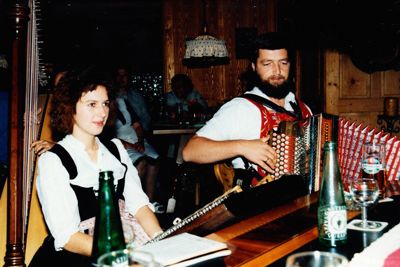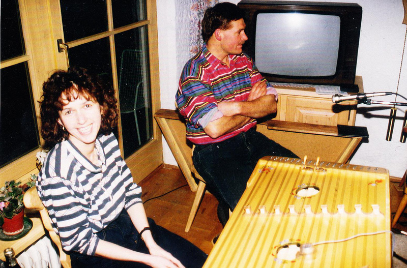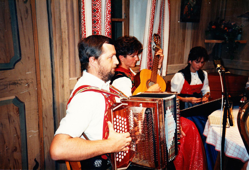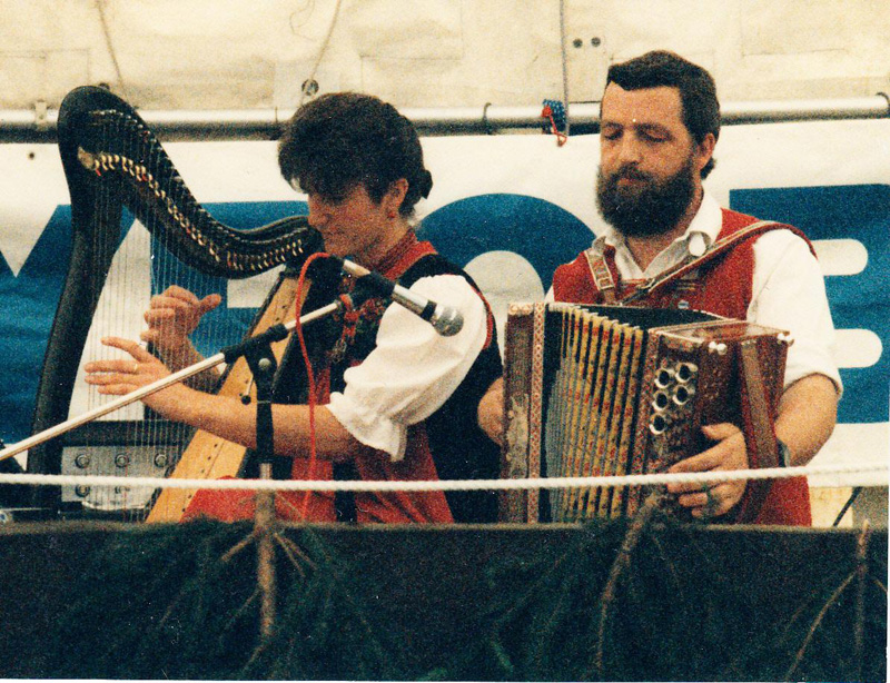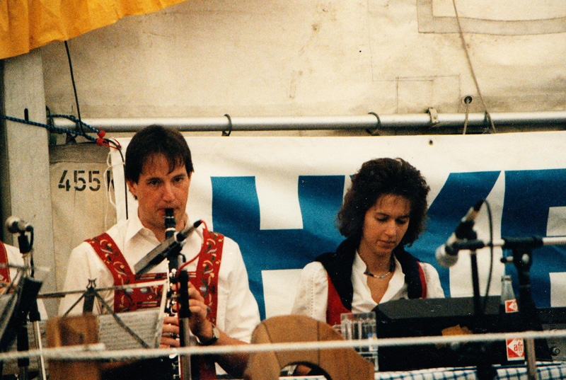 09.06.1989 Harmonietreffen im Steinbockzelt in Bödmen. Christian Math vertritt mit dem Bariton seinen Cousin Richard Math, der sich an diesem Tag im Urlaub befindet. Franziska Kling hat zwischenzeitlich die Gitarre mit einer irischen Harfe getauscht.