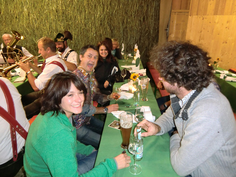 Aber gleich gibt es Nachschub und alle machen sich mit Appetit über ihren wohlgefüllten Teller her. Nur Anton Stark aus dem Großwalsertal, im ORF als eigenwilliger Örgelespieler bekannt, kommt ob der ungewohnt langen Nudeln in arge Verwicklungen und weiß sich schließlich nicht anders zu helfen, als seinen Schnitzer zu ziehen und die von seiner Gabel nach unten hängenden italienischen Köstlichkeiten, quasi „in Lüfta“, auf eine angemessene Länge zu stutzen.