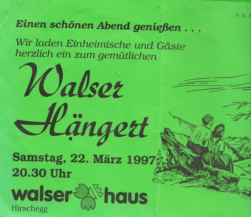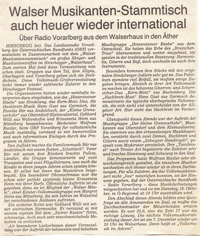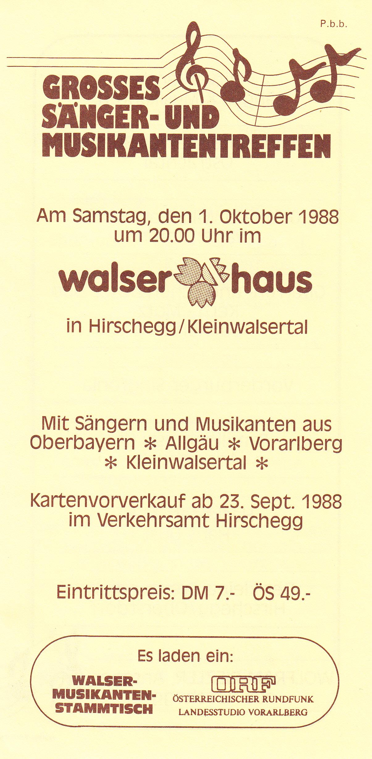 01.10.1988 Sänger- und Musikantentreffen im Walserhaus. Die Veranstaltung wird vom ORF, Radio Vorarlberg aufgezeichnet.