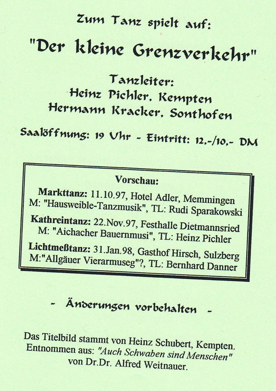 Zu unserem ersten offiziellen Auftritt benötigen wir auch einen für uns geeigneten Namen. Aufgrund der bei Proben und künftigen Auftritten jeweils notwendigen Grenzüberschreitungen einiger Musikanten zwischen Deutschland und Österreich entscheiden wir uns letztendlich für