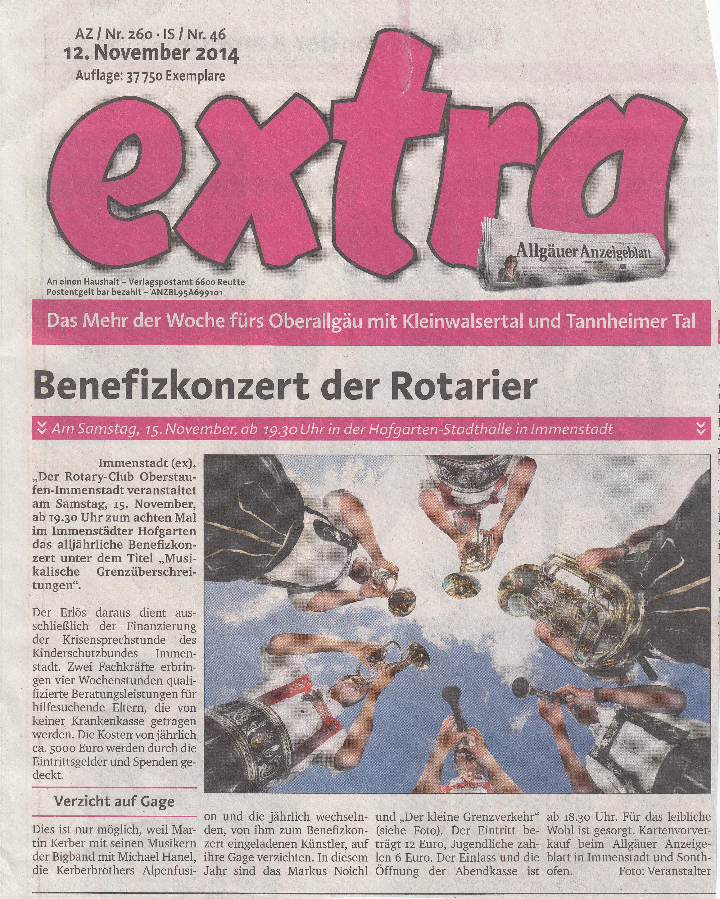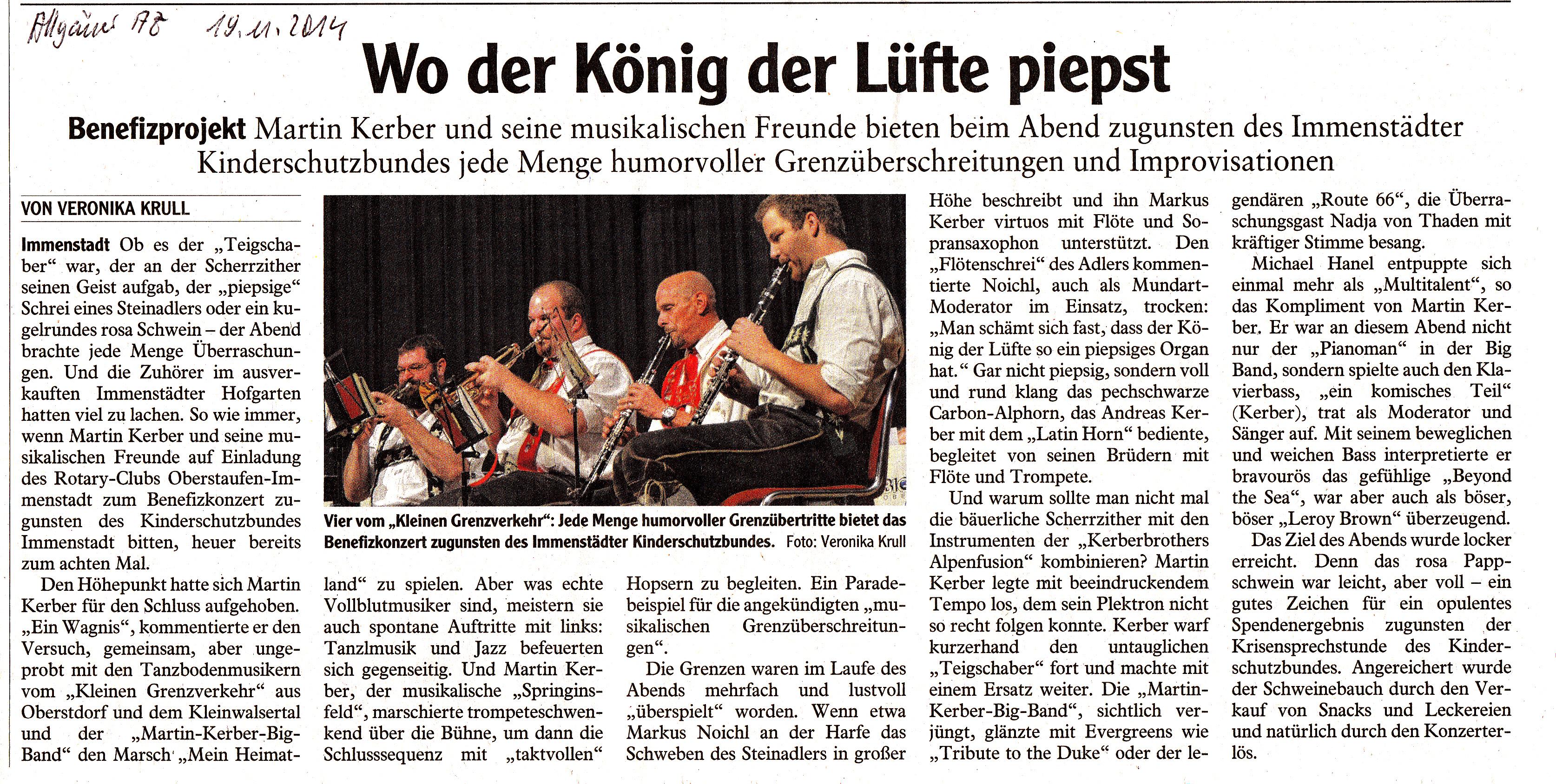 15.11.2014 Benefizkonzert des Rotary-Clubs Oberstaufen-Immenstadt zu Gunsten des Kinderschutzbundes, organisiert von Martin Kerber. Der kleine Grenzverkehr tritt im Immenstädter Hofgarten hier mit Markus Noichl, Harfe, den „Kerber Brothers Alpinefusion“ und der „Martin-Kerber-Big-Band“ auf.