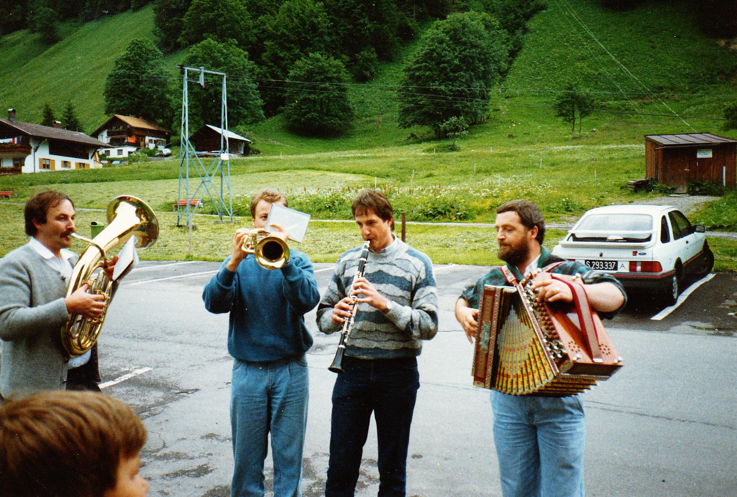 30.09.1989 Ausflug nach Tschagguns im Montafon mit Auftritt im dortigen Gasthof Löwen. Übernachtet wird im Tschaggunser Hof. Gastgeber beider Häuser ist Armin Tschuol, der Posaunist der Montafoner Tanzbodenmusik, den wir bereits an dem Wochenende in St. Arbogast kennengelernt haben.
