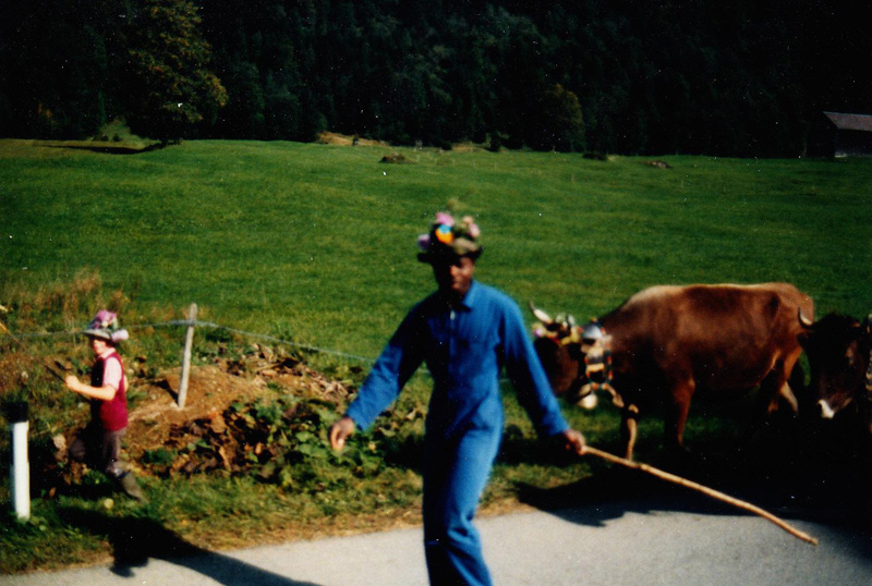 Kaum haben wir auf unserer Fahrt den Bregenzer Wald erreicht, ereignet sich schon der erste Zwischenfall. Alpabtrieb in Hittisau. Als wir die Rinderherde glücklich überholt haben, reiben wir uns beim Anblick des an der Spitze gehenden Hirten verwundert die Augen. Der Haselnuß-stock, der Blaumann und der blumengeschmückte Hut sind ohne Zweifel die üblichen Utensilien bei einer Wälder Alpabfahrt, aber der Hirte selbst war unverkennbar von schwarzer Hautfarbe. Als wir wohl etwas unpassend, aber unserer Meinung nach stilgerecht, aus dem Auto herausgrüßen: „Jambo, Jambo, habari gana!“ erhalten wir ganz unerwartet einen freundlichen Gruß in original Wälder Mundart. Wolfram kann uns, die wir verblüfft auf den Wälder Hirten zurückschauen, aber beruhigen: „Des ischt halt an Schwarzwälder.“