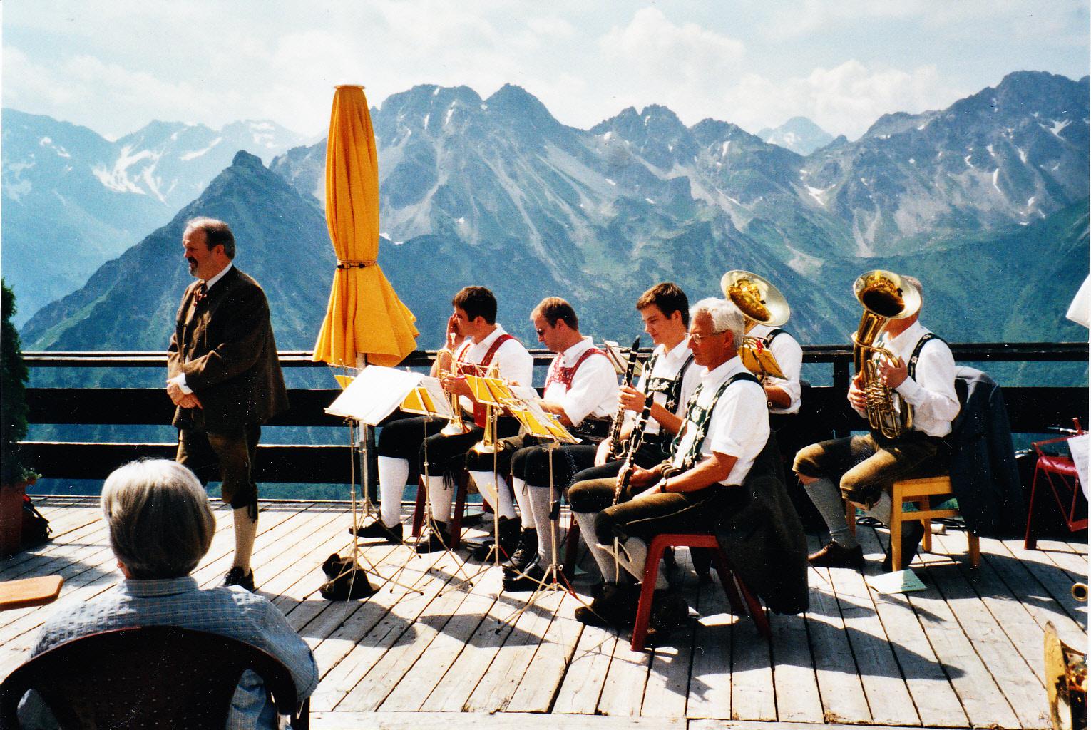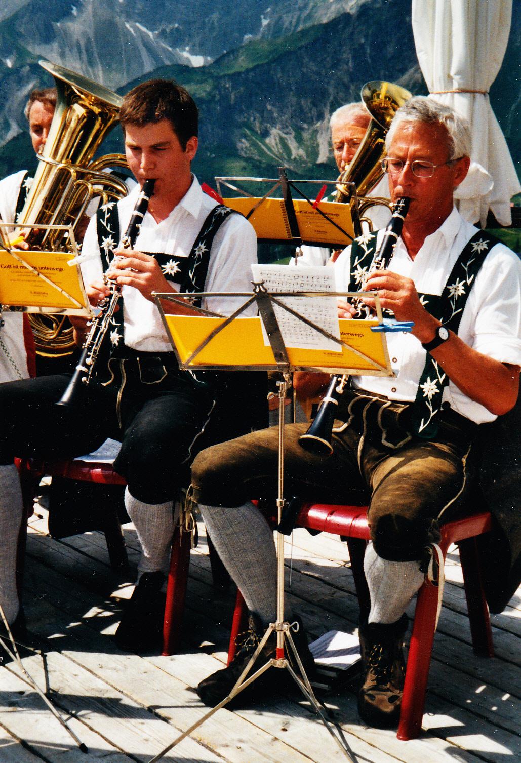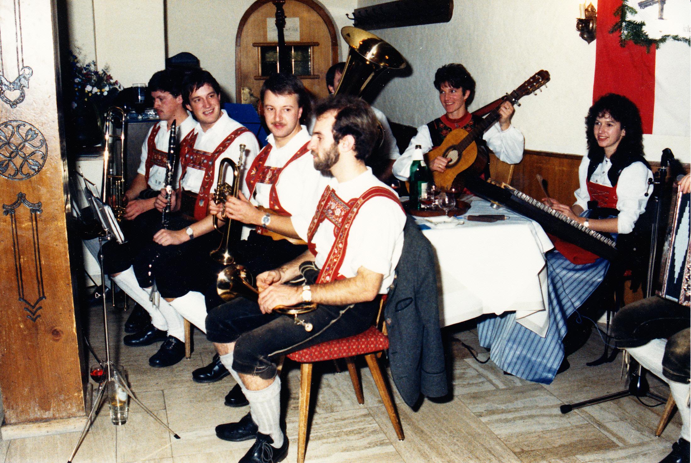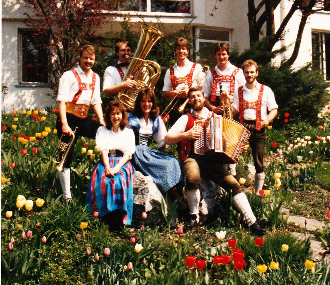 21.09.1986 Bald sind in der Musikkapellen von Oberstdorf und Hirschegg geeignete Musikanten für die neuen Noten gefunden und nach einiger Probenarbeit erfolgt der erste Auftritt zum 60. Geburtstag von Helmut Schuster in Hirschegg.Erste Besetzung: